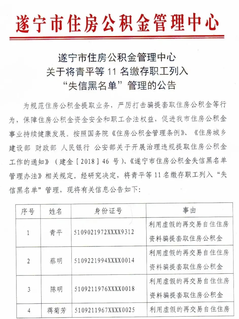 据悉,我市于2018年出台了《遂宁市住房公积金失信黑名单管理办法》(以下简称《办法》)。该《办法》对我市住房公积金管理领域内发生的严重违法违规办理住房公积金行为予以记录,并为依法采取发布、持续监督、失信惩戒等措施提供依据,促使单位、职工纠正违法、失信行为,为保障住房公积金资金安全发挥积极作用。