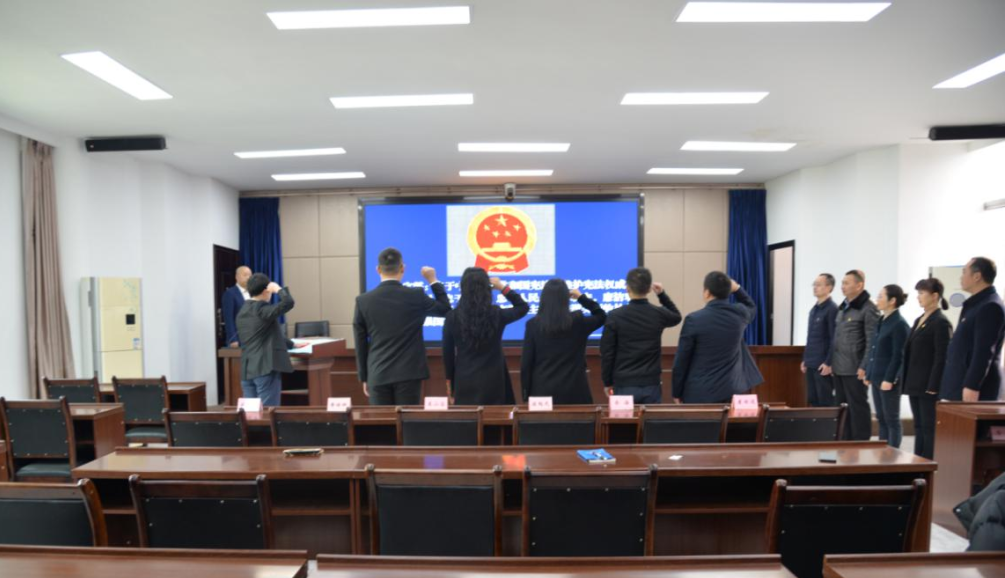 宣誓仪式前,全体人员起立,奏唱中华人民共和国国歌。在参会人员见证下,领誓人手抚宪法,举起右拳,宣读誓词,6名新任科级干部列队站立,跟诵誓词。