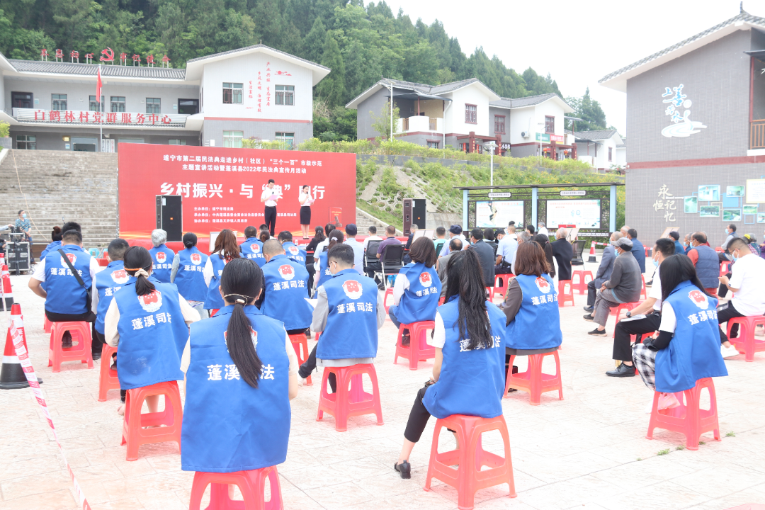 四川省民法典走进乡村(社区)“三个一百”主题宣讲活动被中宣部列为2021年全国文化科技卫生“三下乡”活动示范项目,为持续做大做强活动品牌,结合2022年全省民法典宣传月部署安排,遂宁市司法局、蓬溪县司法局、文井镇人民政府以“乡村振兴·与‘典’同行”为主题在文井镇白鹤林村开展《民法典》走进乡村“三个一百”法治宣讲活动和法治文艺节目汇演。市司法局党组成员、机关党委书记徐南平出席并讲话。县司法局党组书记、局长陈俊宏,文井镇党委副书记、镇长陈代军参加活动。活动有群众方队、人民调解员方队、法律明白人方队、“蓝精灵”普法先锋团方队参加。