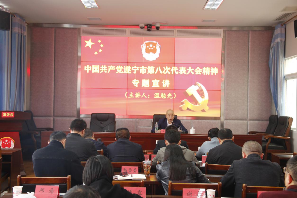 宣讲会上,温勉光从深刻领会遂宁中华人民共和国成立以来发展历程中的辉煌成就、准确把握遂宁发展面临的矛盾、问题和困难、准确把握遂宁未来发展的目标和思路、全力推动党代会各项部署落地落实四个方面进行了主题宣讲。宣讲报告脉络清晰、深入浅出地讲述了过去五年来遂宁的快速发展,讲清了今后五年遂宁筑“三城”兴“三都”、实施“六大对标竞进行动”,加速升腾“成渝之星”的宏伟蓝图,对学习贯彻落实市第八次党代会精神具有很强的指导性和针对性,参会人员倍受鼓舞。