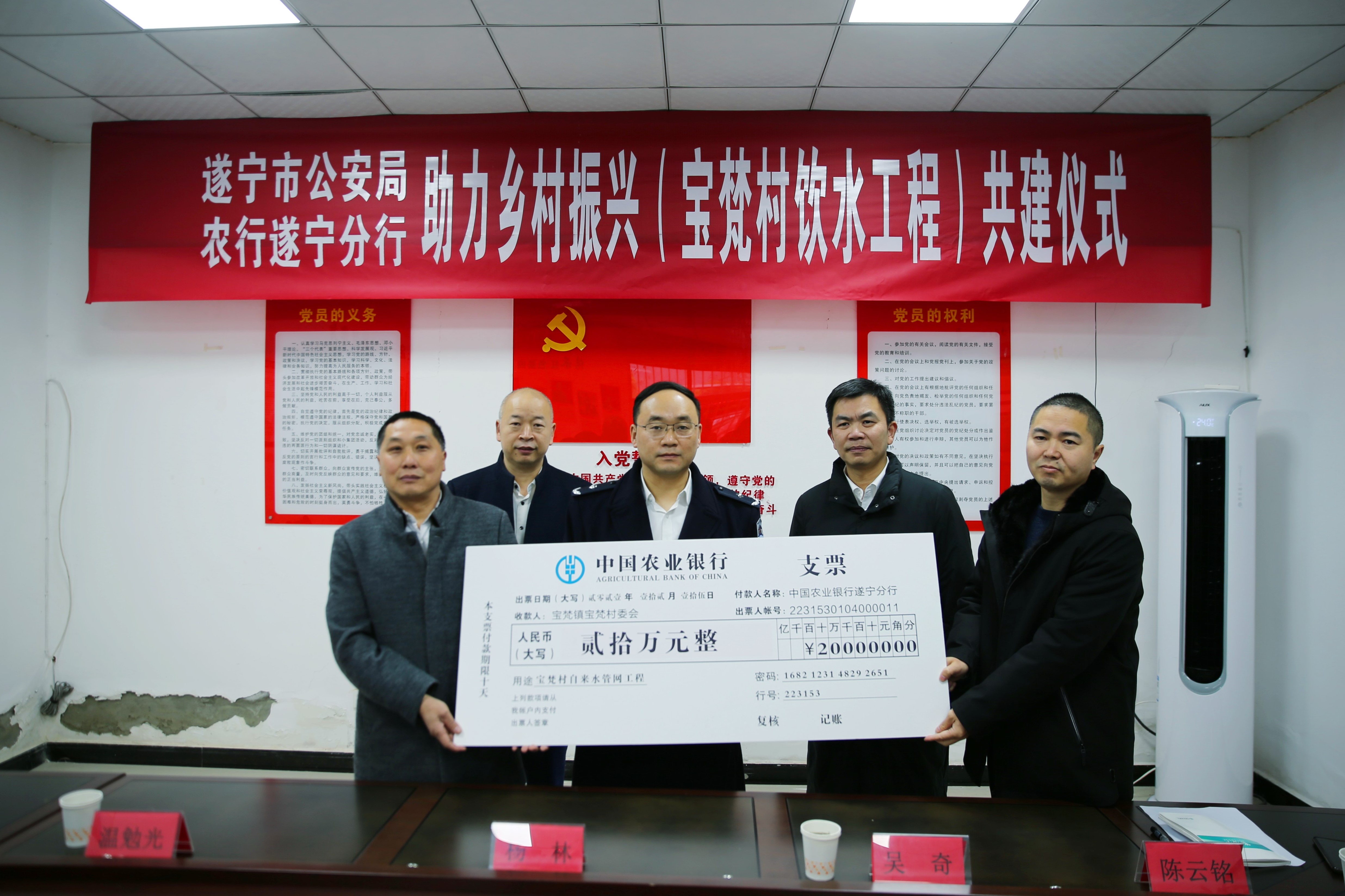 12月15日,一场简朴的捐赠仪式在蓬溪县宝梵镇宝梵村举行。遂宁市司法局以“我为群众办实事”法治惠民行动为契机,为宝梵村捐赠5万元,用于法治文化阵地建设。同时,经市公安局、市司法局协调,中国农业银行遂宁分行向宝梵村捐赠20万元,共建宝梵村饮水工程。副市长、市公安局局长杨林,市司法局党组书记、局长温勉光,中国农业银行遂宁分行行长吴奇出席捐赠仪式。