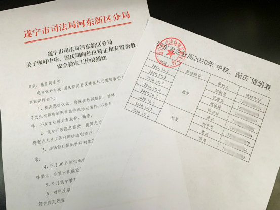 一是9月24日分局召开例会,传达了省、市关于做好节假日期间安全稳定相关工作的会议精神和要求,分析研判了辖区可能存在的风险隐患,对近阶段重点工作作了详细部署。二是下发《关于做好中秋、国庆期间社区矫正和安置帮教安全稳定工作的通知》,强化责任意识,细化工作目标,落实工作措施,强调了监管纪律要求,要求加大摸排力度,确保消除影响安全稳定的隐患苗头。三是落实应急值班制度,明确责任分工、处置程序和应对措施,严格落实日报告制度,重大事项请示报告制度,将安全稳定责任落实到岗到人。