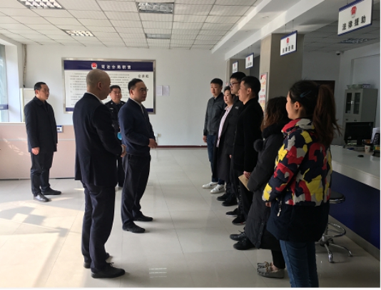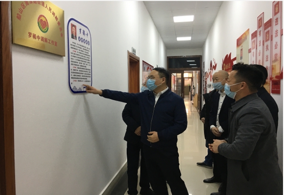 船山区司法局局长陈飞向杨林副市长汇报了南津路司法所人民调解、社区矫正、法治宣传等工作,并特别介绍了监狱远程视频会见系统,杨林副市长指出:“监狱会见采用远程的方式很好,既避免了去监狱会见的人来回奔波,也减少了疫情期间的感染风险”。在罗稀中品牌调解工作室,当他看到“带着感情去工作,让法律更有温度与力量”的个人工作感言时,感慨道:“这句话真好啊!我们就是要带着对党和人民群众炙热的情感去工作,在具体执行法律时既要彰显法律的温度,也要体现法律的力量,两者缺一不可!”