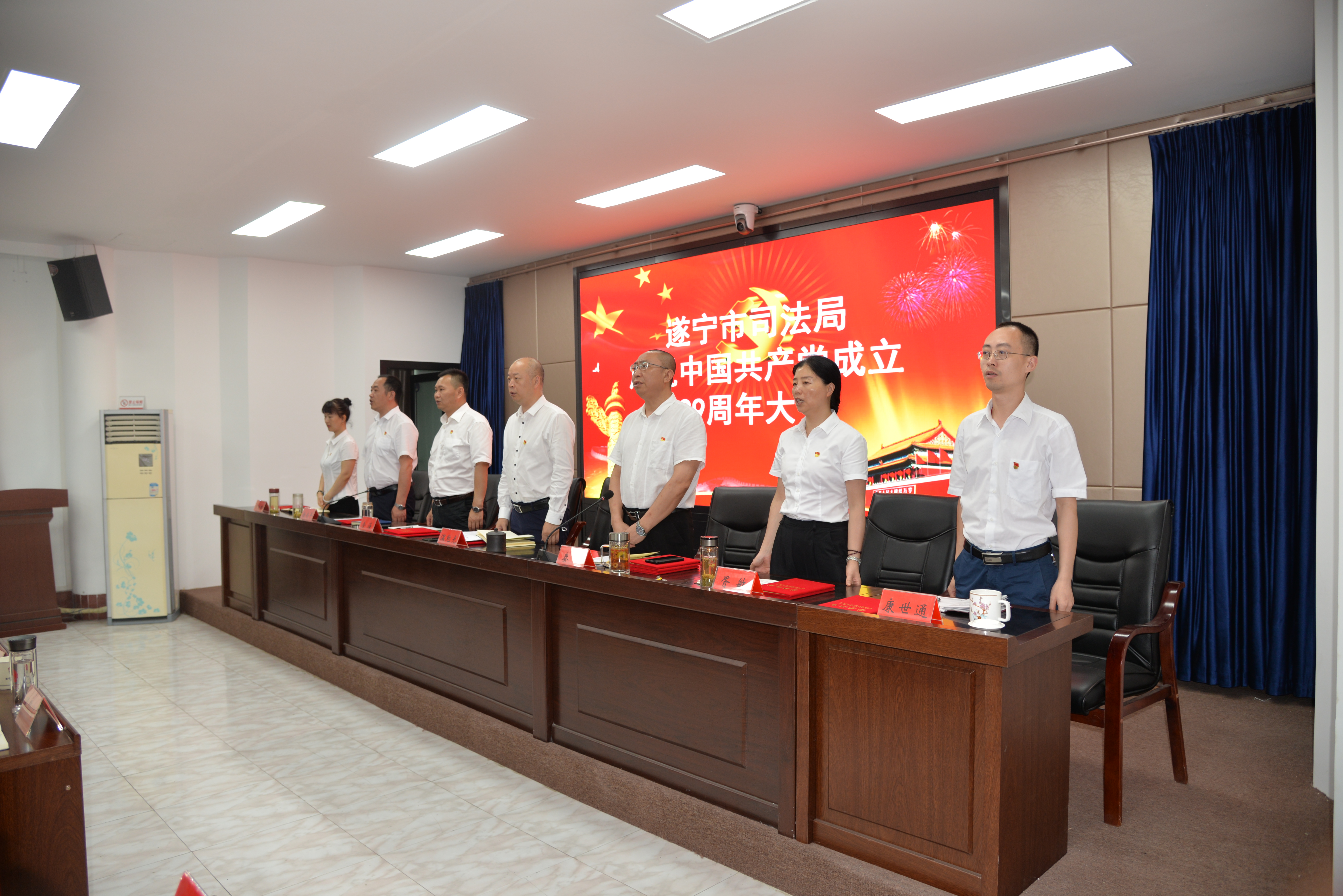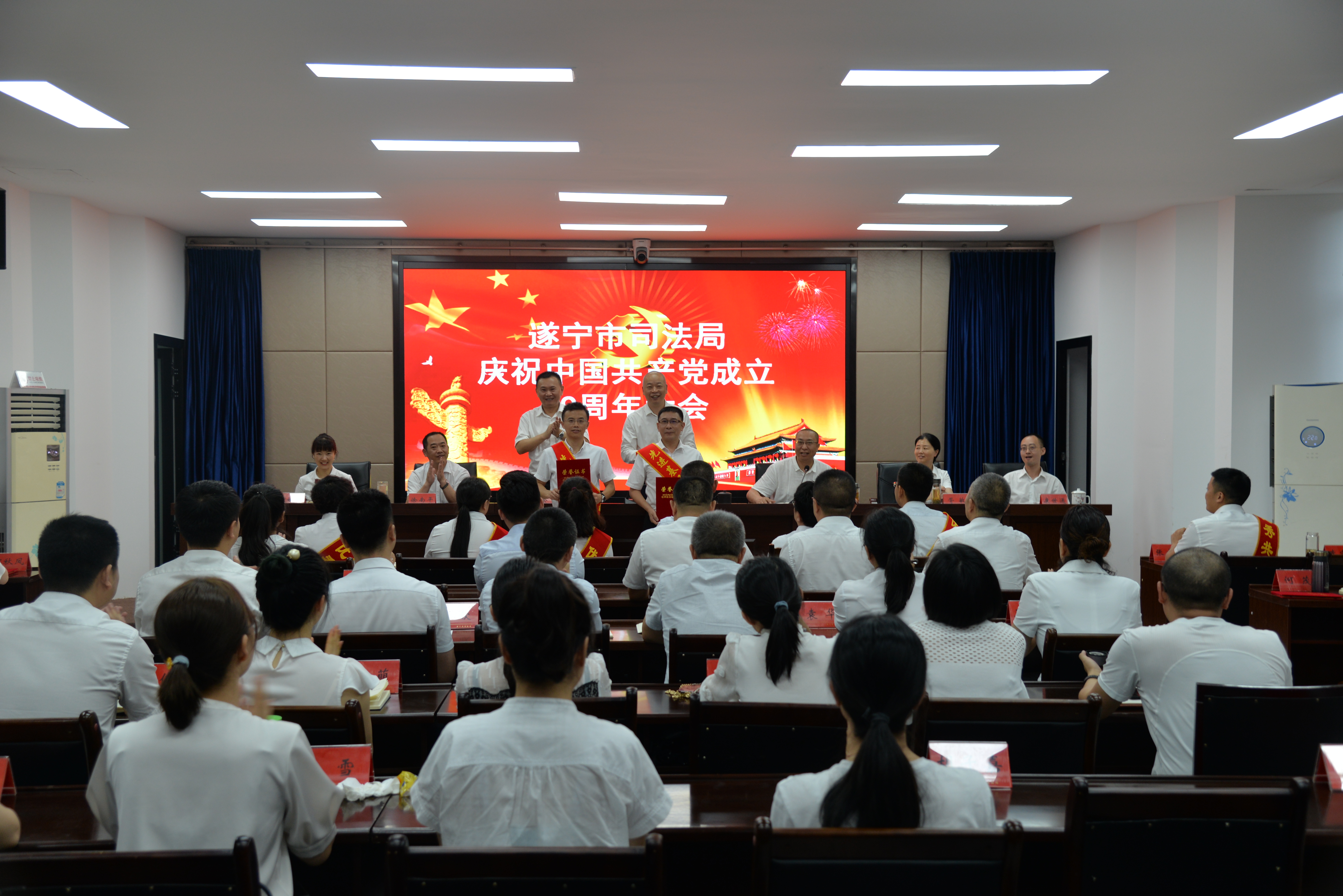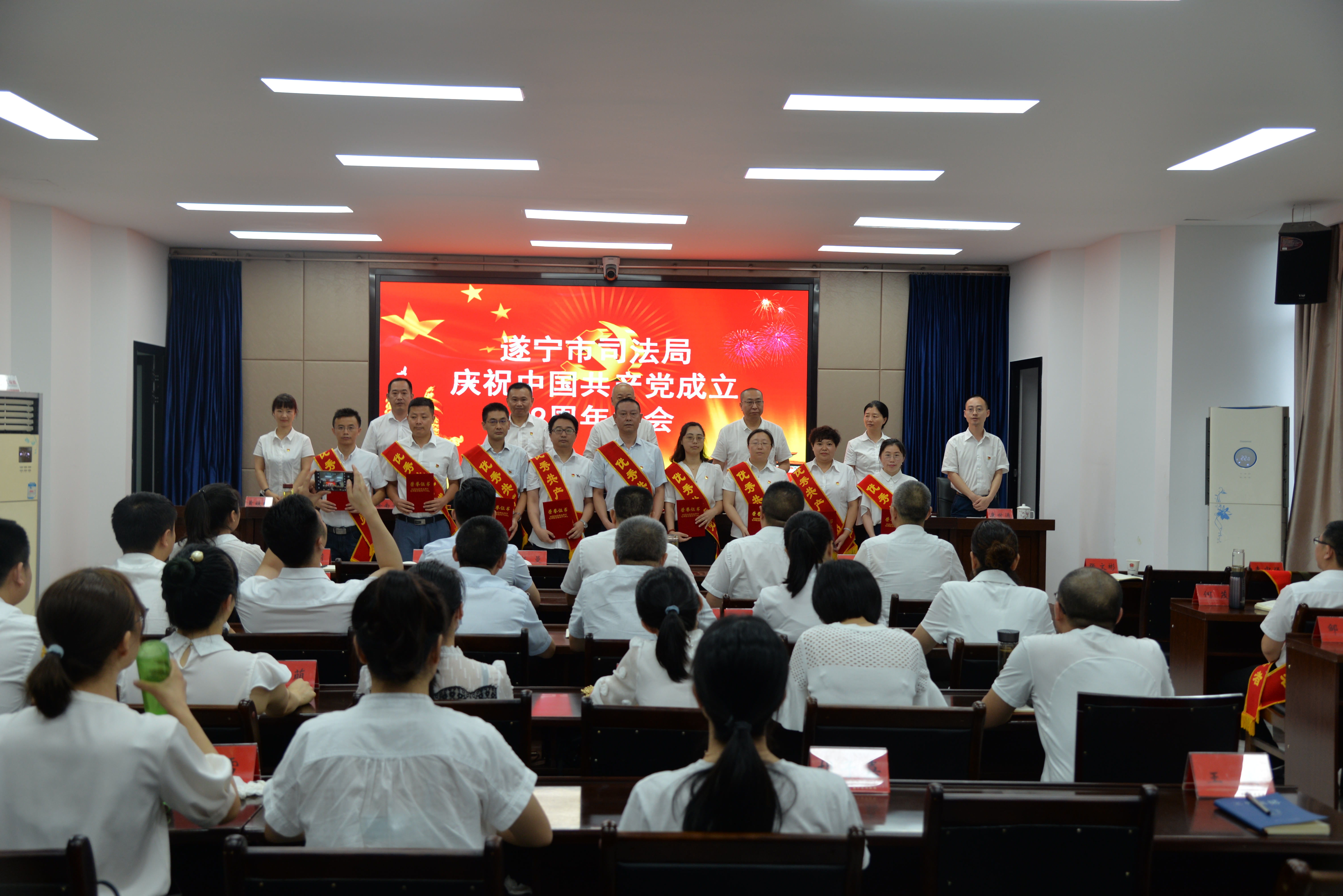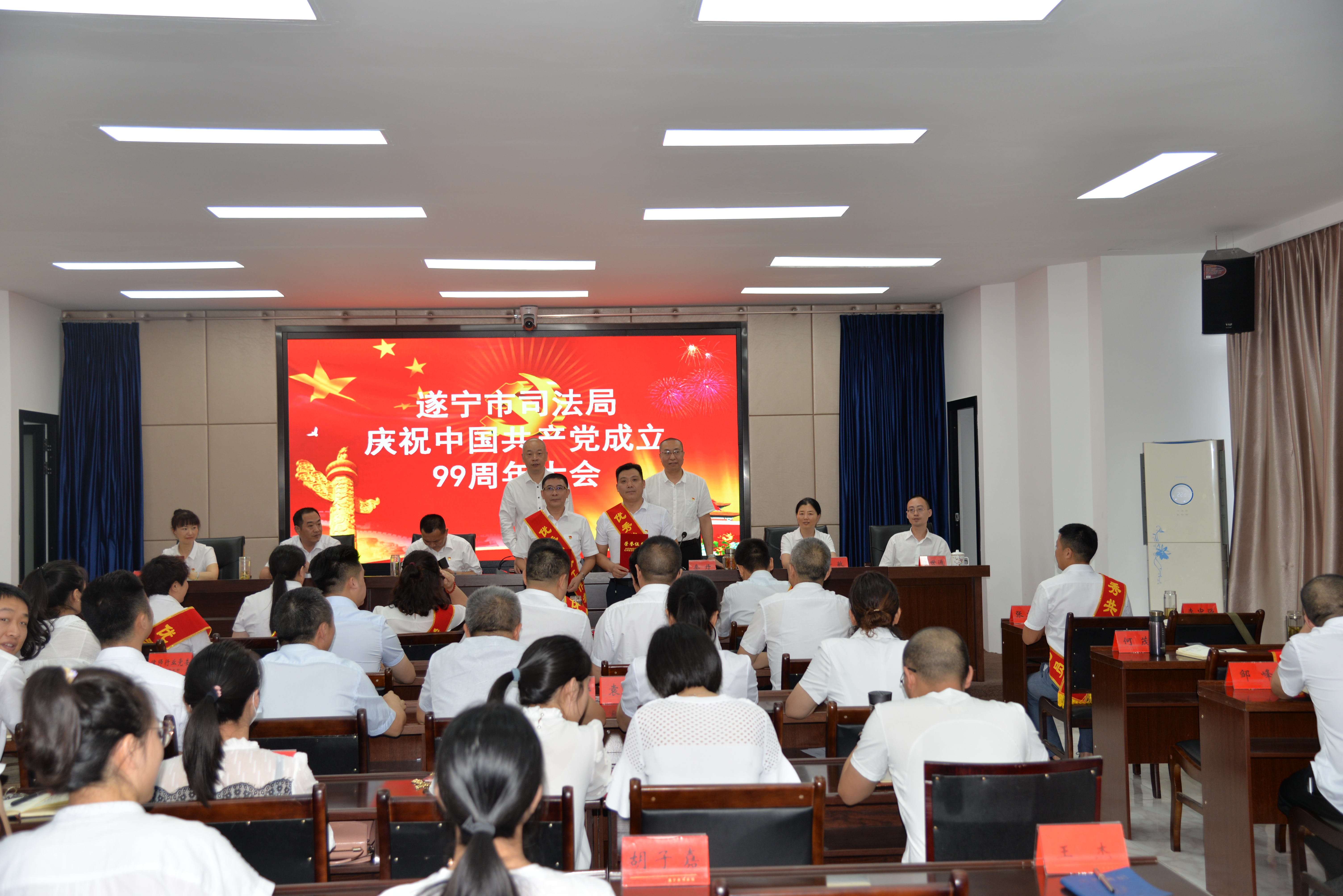 在中国共产党成立99周年之际,为深入学习贯彻习近平新时代中国特色社会主义思想,全面贯彻落实党的十九大精神,培树先进典型,激发机关、事业单位党员干警谋事干事、创新创造的昂扬斗志和奋发有为的工作激情,不断提高机关党组织的创造力、凝聚力和战斗力。7月1日,中共遂宁市司法局机关委员会召开"七一"表彰大会,全局50余名党员及市律协部分党员律师代表参加,大会由局党组成员、副局长秦丹主持。