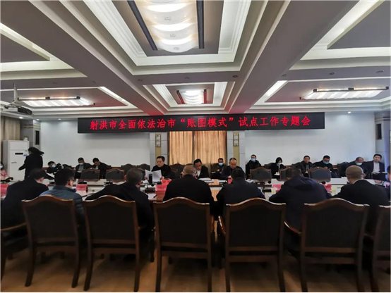2月19日,射洪市全面依法治市“账图模式”试点工作专题会在市委二会议室召开,市委副书记、市委全面依法治市委员会副主任潘化荣,副市长、市公安局局长郭晖出席会议。会议由市委常委、政法委书记任德武主持,市市场监管局、市司法局、金华镇等10个第一批试点单位主要领导、分管领导及具体工作人员,市委绩效办、市委编办分管负责同志,全面依法治市示范试点办公室全体人员参加会议。