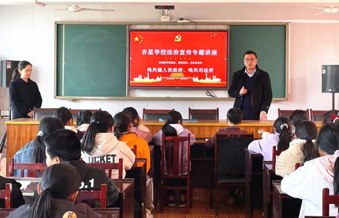 3月1日至2日,蓬溪县司法局鸣凤司法所、鸣凤镇综治办先后到蓬溪县鸣凤镇吉星学校、鸣凤小学、鸣凤中学开展以校园安全、禁毒、家庭教育促进法、民法典宣传为主题的法治教育小课堂。