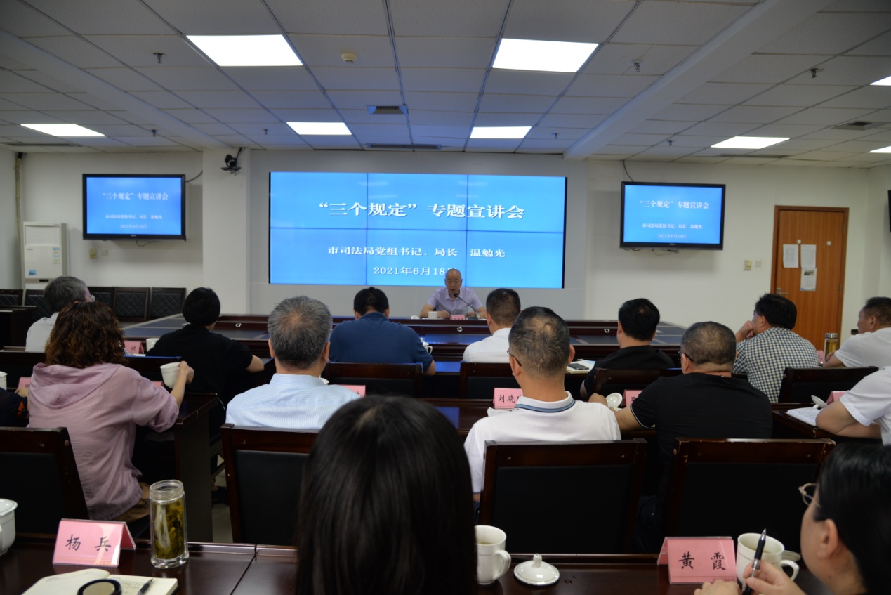 6月18日,防止干预司法“三个规定”专题宣讲会在市环岛商务中心5429会议室召开,市委巡查办等12个单位的41名党政领导干部参加了本次宣讲活动。市司法局党组书记、局长温勉光作为“三个规定”宣讲团成员在会上作了专题宣讲,主要从“三个规定”的出台背景、现实意义、主要内容、典型案例、政策边界等方面,深度解读了执行“三个规定”的重要性和必要性。