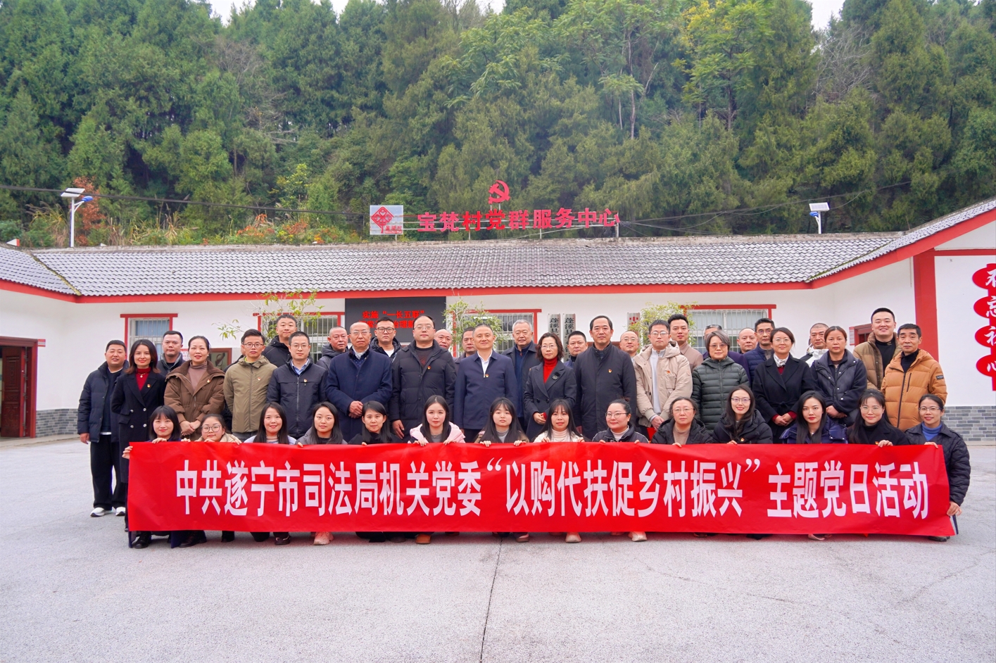 12月27日,中共遂宁市司法局机关党委在蓬溪县宝梵镇宝梵村开展“以购代扶促振兴”主题党日活动,旨在落实“四下基层”要求,助力农村联系点的发展,帮助脱贫群众巩固脱贫成效,同时增强党员干部的服务意识和责任担当。