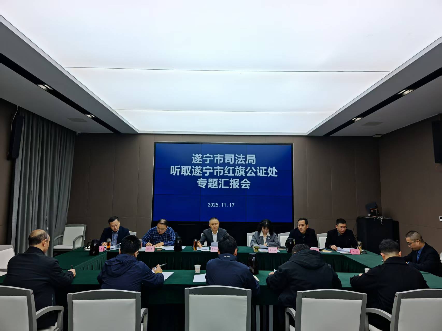 2025年11月17日上午,市司法局党组书记、局长李静波主持召开专题会议,听取遂宁市红旗公证处工作情况汇报。局领导班子全体成员、相关科室负责人及遂宁市红旗公证处理事会成员参加会议。