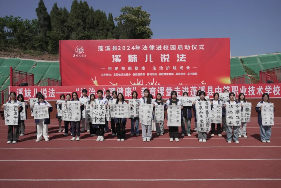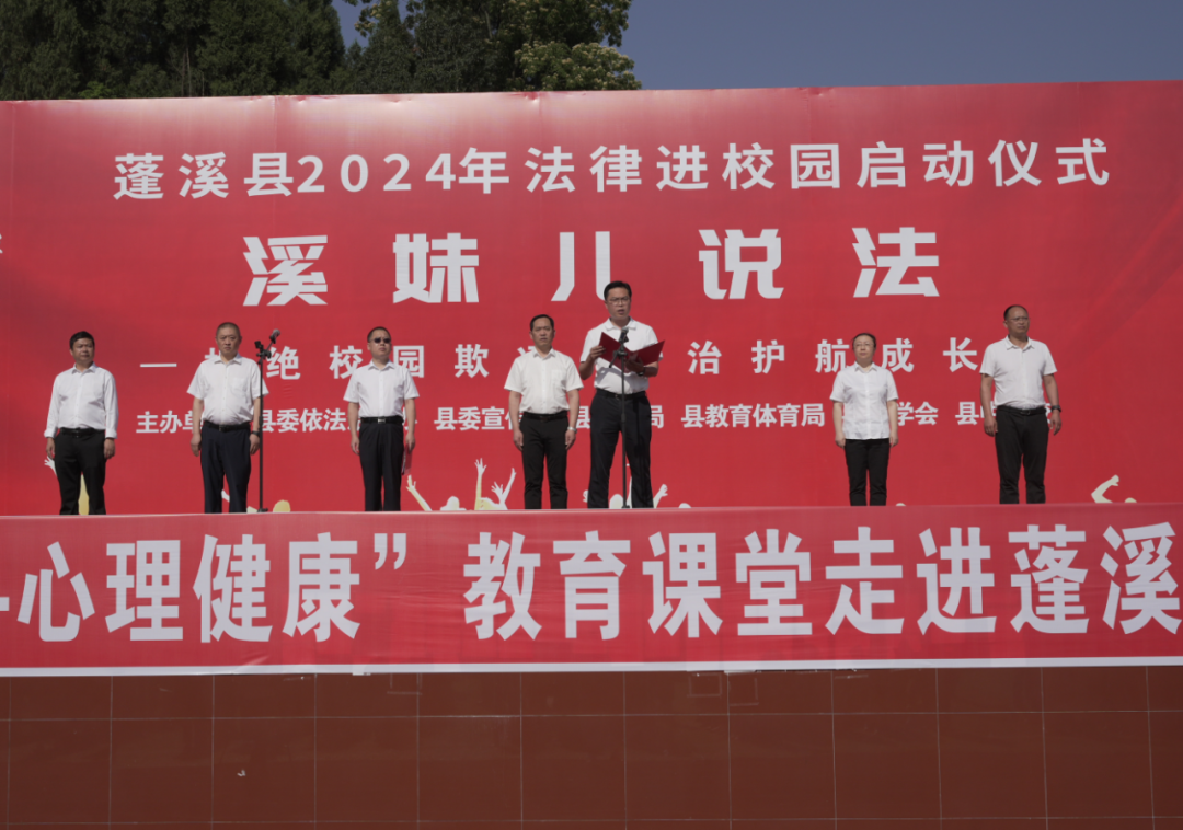 为深入学习宣传贯彻党的二十大精神和习近平法治思想,教育引导青少年尊法、学法、守法、用法,构建和谐友好、平安有序的法治校园,5月13日,由县委依法治县办、县委宣传部、县司法局、县教育体育局、县法学会主办的蓬溪县2024年法律进校园启动仪式暨“法治+心理健康”教育课堂在蓬溪县中等职业技术学校举行。遂宁市司法局党组成员、机关党委书记徐南平出席活动,县委常委、县委宣传部部长张萌出席活动并讲话,副县长、县公安局局长张宏亮主持启动仪式,市司法局相关科室负责同志、县委政法委、县教育体育局、县司法局、县法学会主要或分管负责同志、县中职校1000余名师生参加活动。
