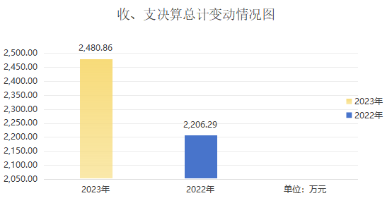 2023年度收、支总计均为2480.86万元。与2022年度相比,收、支总计各增加274.57万元,增长12.44%。主要变动原因是业务用房房顶打造了法治文化园地,承办了全国法治论坛。