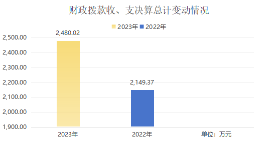2023年度财政拨款收、支总计均为2480.02万元。与2022年度相比,财政拨款收、支总计各增加330.65万元,增长15.38%。主要变动原因是承办了全国法治论坛。