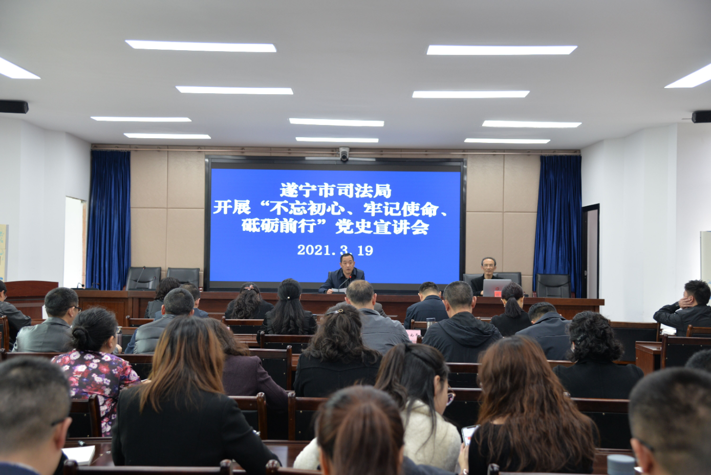 自全市政法系统队伍教育整顿开展以来,遂宁市司法局精心制定学习教育计划,将队伍整顿与党史学习教育有机结合,扎实开展教育整顿,务求取得实效。3月19日下午,在局八楼会议室,市委党校高级讲师邓晓宁同志受邀为全局司法干警以“中国共产党百年奋斗的光辉历程”为题讲授党课。市政法委副书记冉光学一行到会督导,与全局干警一起听党课、学党史。