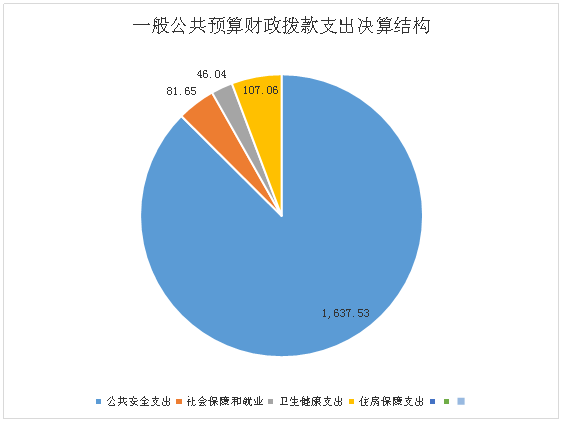 2022年一般公共预算财政拨款支出1,872.29万元,主要用于以下方面:公共安全(类)支出1,637.53万元,占88%;社会保障和就业(类)支出81.65万元,占4%;卫生健康支出46.04万元,占3%;住房保障支出107.06万元,占5%;。