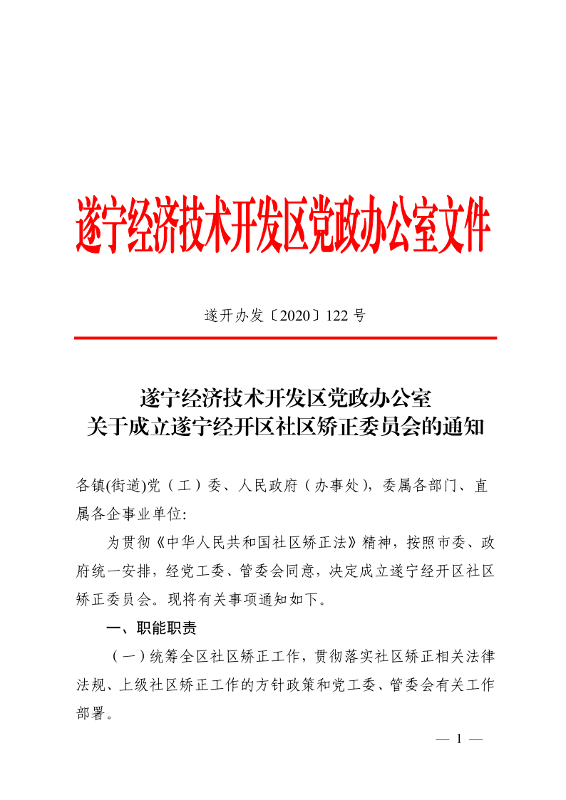 为进一步规范社区矫正工作开展,按照《社区矫正法》和省、市相关要求,8月12日,遂宁经开区党政办公室印发了《关于成立遂宁经开区社区矫正委员会的通知》,决定成立遂宁经开区社区矫正委员会,建立起党委政府统一领导,司法部门组织实施,相关部门协同配合,社会力量广泛参与的责任共担、各司其职、齐抓共管的责任机制。